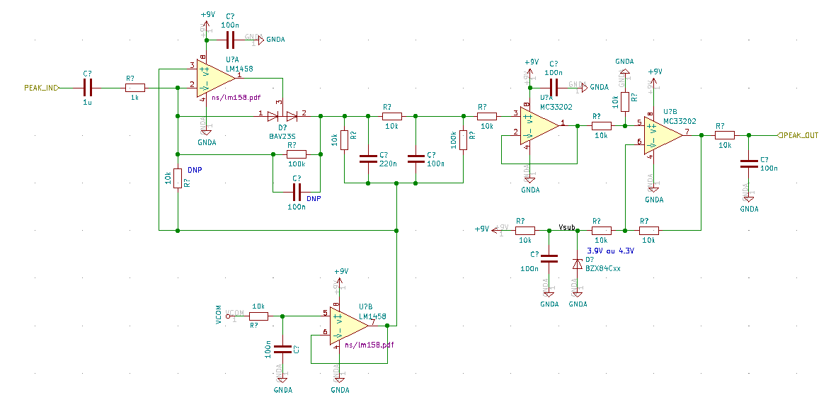 Au final, l’AOP d’entrée à gauche doit être compensé, donc on met un LM1458, et les deux suivants sont des MC33202. La capa C1 de 100n est optionnelle et est censée améliorer la réactivité. Les simus montrent des résultats contrastés, donc je ferai des essais pour voir comment ça se comporte. Derrière la capa du détecteur j’ajoute un filtre RC (R4-R5-C3) qui va atténuer l’amplitude et lisser le signal. Au pire, si ça devient trop lent, je ne monte pas la capa. U2 est juste un buffer, nécessaire pour que l’étage d’offset qui suit fonctionne. Il va soustraire la tension qu’il est présentée sur son entrée négative. Soit on met une valeur fixe avec une zener (3.9V ou 4.3V devrait être pas mal), soit on le définit avec un pont diviseur sur l’alim + buffer. La deuxième solution me semble inutilement plus complexe, donc je vais rester sur la solution zener.