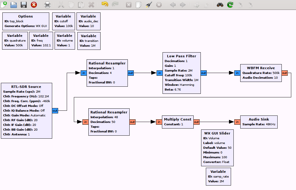 - Le slider de volume justement, on définit un contrôle qui va varier entre deux valeurs, ici j’ai mis de 0 à 100, en float. Sur le chemin du signal audio (donc après le WBFM - qui est le démodulateur - et le Resampler, en fait juste avant le Audio Sink qui est la sortie vers la carte son, c’est pas mal), on met un Multiply Const, qui est un bloc qui va multiplier le signal par une valeur, qui ne provient pas d’un autre flux. Il faut le configurer en float (sinon les connections ne se font pas), et si dans le champ “Constant” on met l’ID du slider (ici “Volume”, que je divise par 100 pour avoir une valeur entre 0 et 1 en float), le fait de bouger le slider va changer la valeur de la constante … Qui est donc variable :D Tout est normal.